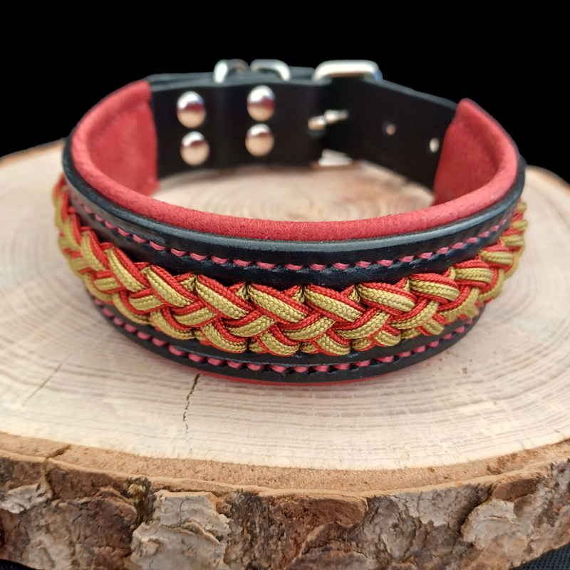 Lederen halsband met een koninklijke uitstraling in een combinatie van gevlochten paracord in rood en goud op een basis van zwart leer.