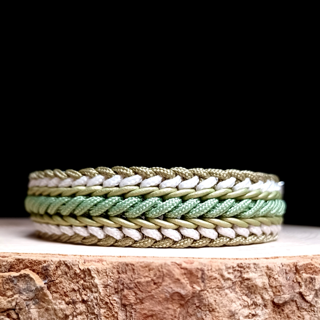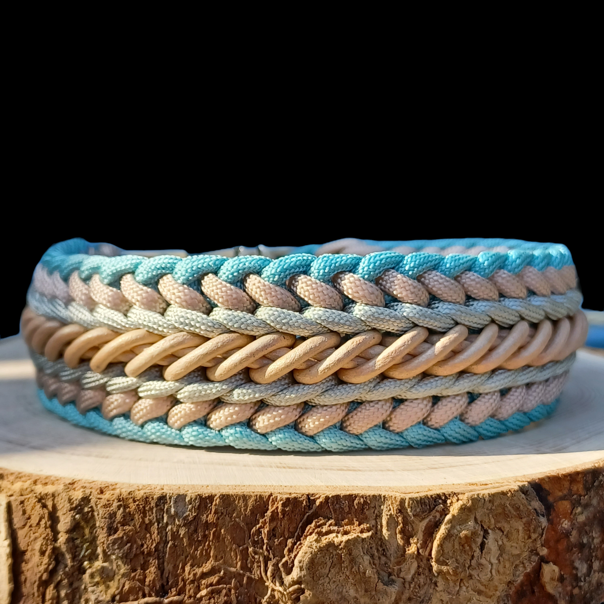 Gemaakt in type 3 paracord, is deze halsband ongeveer 4,5 cm breed en indien gewenst kan 1 kleur paracord vervangen worden door een lederen koord.